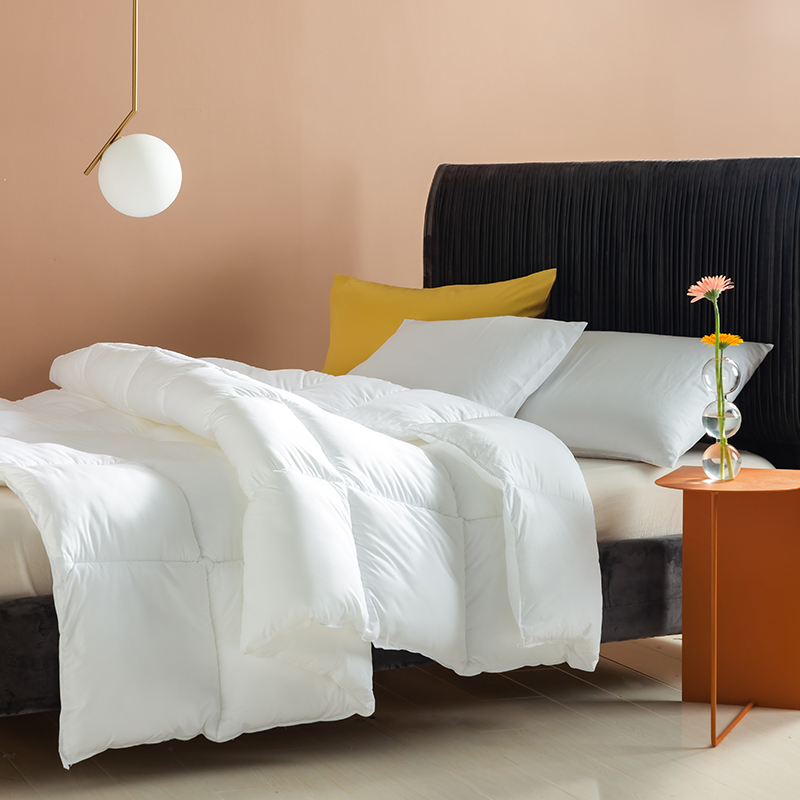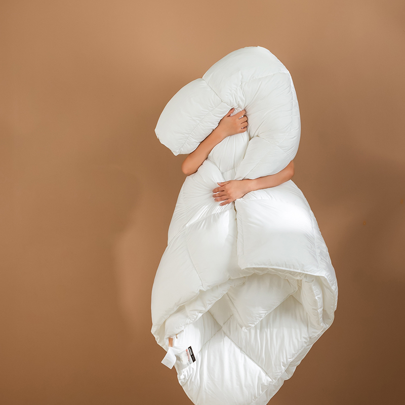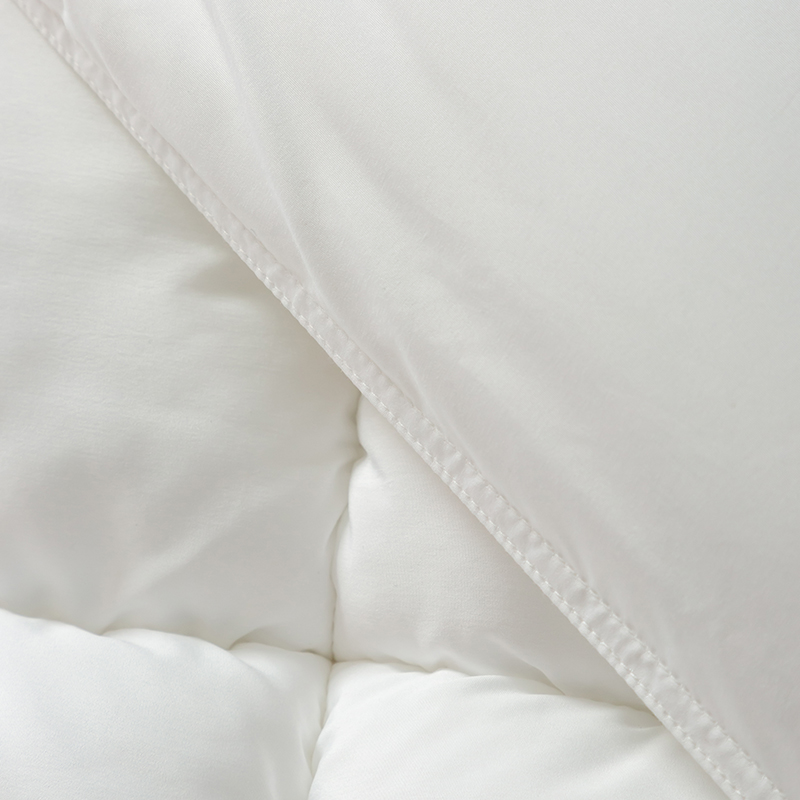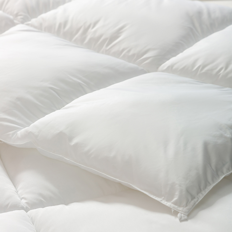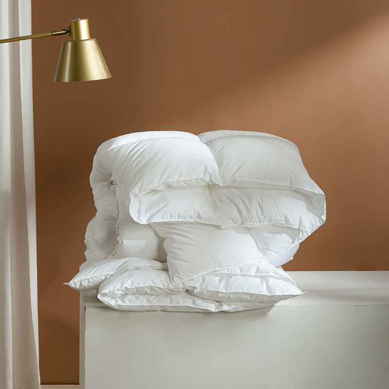 この羽毛布団には高品質のグースダウンが充填されており、大きくて膨らんだクラスターが特徴で、優れたロフトと弾力性を備えています。グースダウンの自然な立体構造は空気を閉じ込めて効果的な断熱層を形成し、軽量で非圧縮性の感触を維持しながら、寒い冬の夜に格別な暖かさを確保します。この羽毛布団は綿 100% で作られ、233 ~ 300 のハイカウント (TC) カウントで精密に織られています。ご要望に応じて、さらに高い仕様も利用可能です。綿生地は自然に肌に優しく、通気性に優れ、湿気を効果的に発散し、ムレを防ぎ、睡眠中をドライで快適に保ちます。当社の古典的な市松模様のキルティング技術により、グースダウンがそれぞれの小さなグリッド内にしっかりと固定され、ダウンが動いたり蓄積したりするのを防ぎます。これにより、厚みが均一になり、暖かさが長続きするため、この羽毛布団は見た目にも美しく、実用性にも優れています。