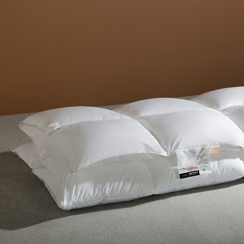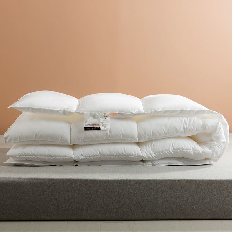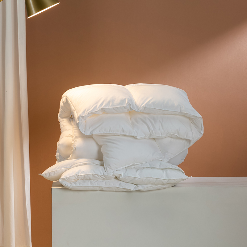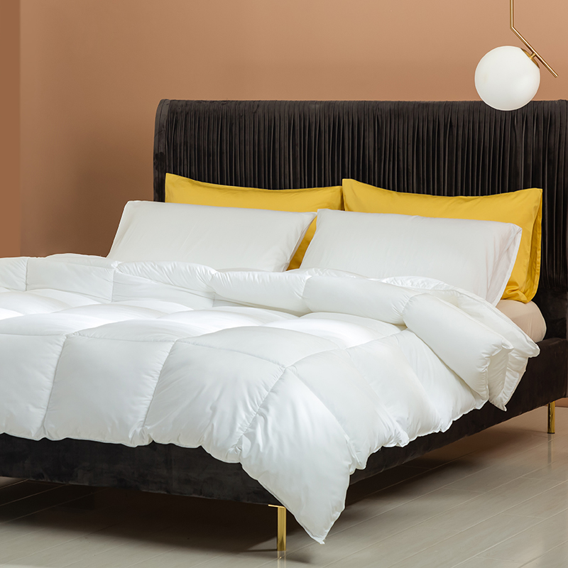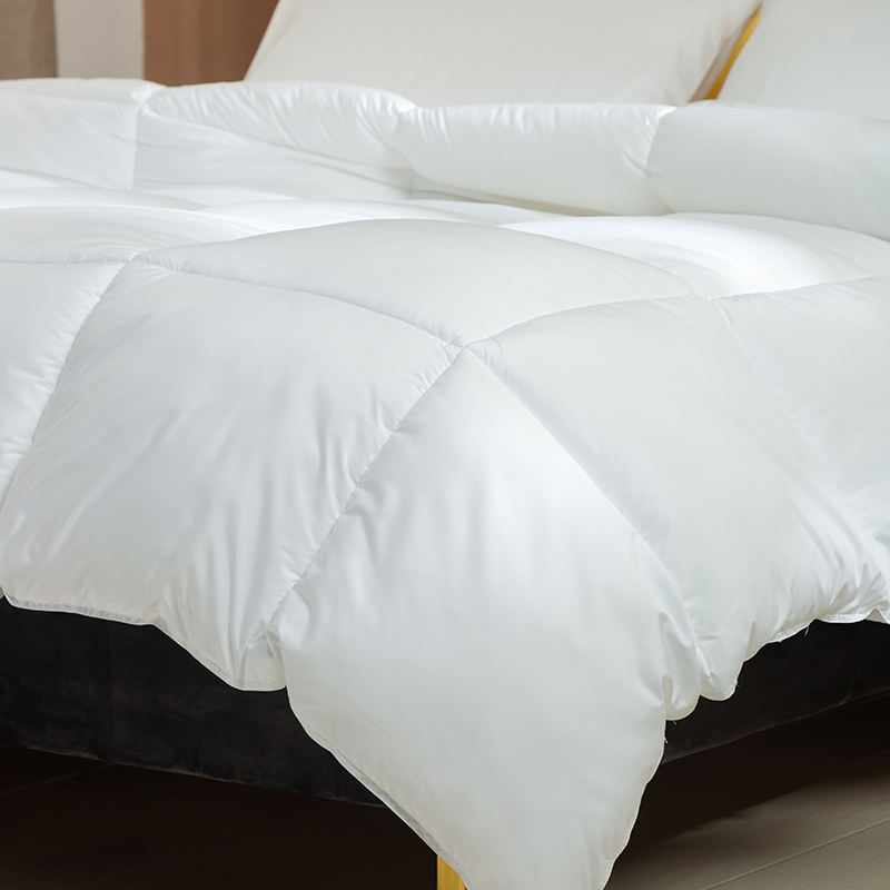 この羽毛布団には高品質のグースダウンが充填されており、大きくて膨らんだクラスターが特徴で、優れたロフトと弾力性を備えています。グースダウンの自然な立体構造は空気を閉じ込めて効果的な断熱層を形成し、軽量で非圧縮性の感触を維持しながら、寒い冬の夜に格別な暖かさを確保します。この羽毛布団は綿 100% で作られ、233 ~ 300 のハイカウント (TC) カウントで精密に織られています。ご要望に応じて、さらに高い仕様も利用可能です。綿生地は自然に肌に優しく、通気性に優れ、湿気を効果的に発散し、ムレを防ぎ、睡眠中をドライで快適に保ちます。当社の古典的な市松模様のキルティング技術により、グースダウンがそれぞれの小さなグリッド内にしっかりと固定され、ダウンが動いたり蓄積したりするのを防ぎます。これにより、厚みが均一になり、暖かさが長続きするため、この羽毛布団は見た目にも美しく、実用性にも優れています。